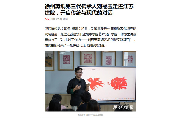 現代快報訊(記者 鄭陽)近日,劉冠玉受徐州非物質文化遺產研究院邀請,走進江蘇建筑職業技術學院藝術設計學院,作為主講嘉賓參與了“24小時工作坊——劉冠玉剪紙藝術創新實踐項目”,為師生們帶來了一場傳統與現代的穿越對話。